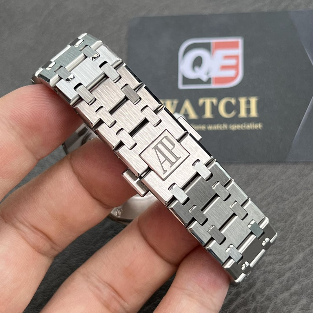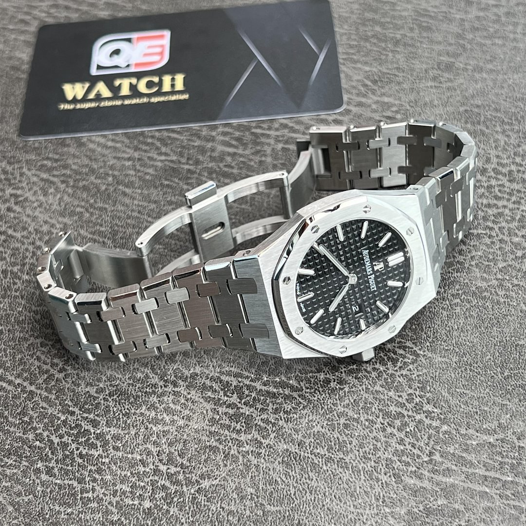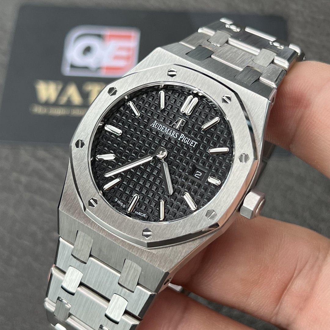 33 mm stainless steel case, 7 mm thick, glareproofed sapphire crystal, black dial with Grande Tapisserie” pattern, white gold applied hour-markers and Royal Oak hands with luminescent coating, Calibre 2713 quartz movement with hours, minutes, date, stainless steel bracelet, AP folding buckle.