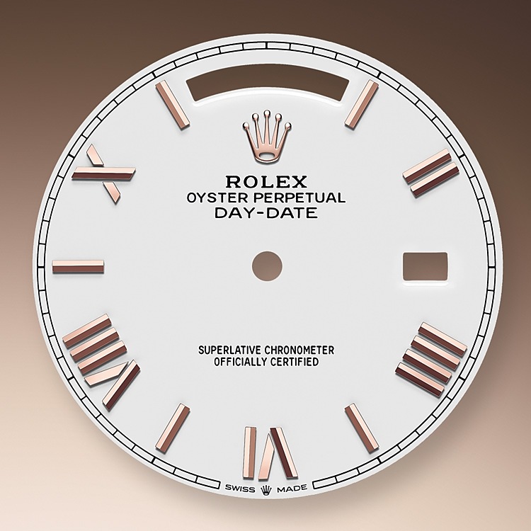 The Rolex fluted bezel is a mark of distinction. Originally, the fluting of the Oyster bezel had a functional purpose: it served to screw the bezel onto the case helping to ensure the waterproofness of the watch. It was therefore identical to the fluting on the case back, which was also screwed onto the case for waterproofness, using specific Rolex tools. Over time, the fluting became an aesthetic element, a genuine Rolex signature feature. Today the fluted bezel is a mark of distinction, in gold on this Day-Date 40.